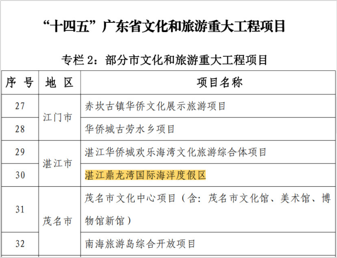 鼎龙湾入列广东省文化和旅游发展“十四五”规划重大工程项目