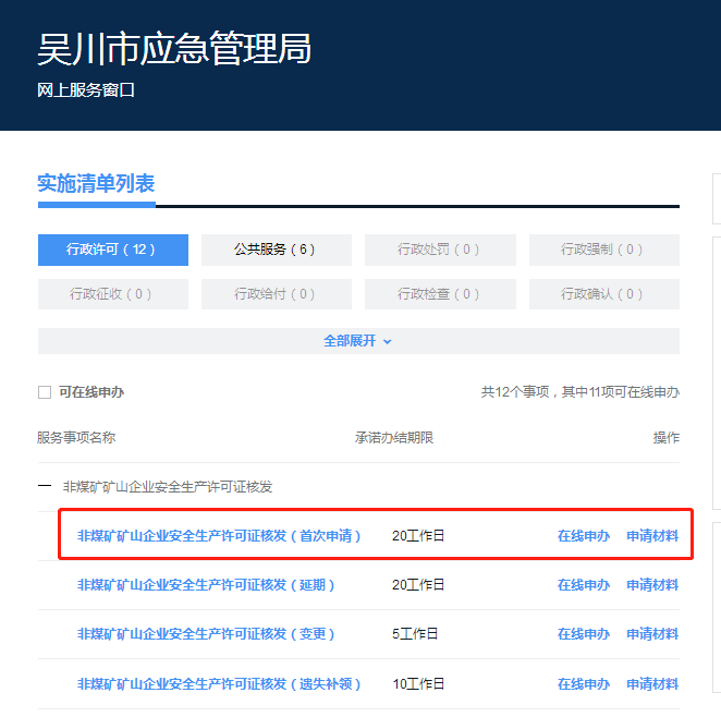 2.在部门窗口页面,选择要办理【事项类型】——【事项名称】,点击【在线办理】。
