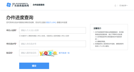 2.输入【申办人名称】和【申办流水号】即可查询办理进度。