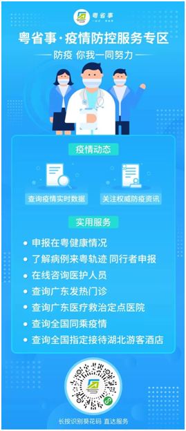 日前,“粤省事”移动政务服务平台正式上线“广东疫情防控服务”专区,包括四大内容和相关服务——全国疫情情况、权威防疫资讯、群防群治战疫情和防疫便民。广大用户可通过该专区实时获取最新疫情信息,查询疫情线索及疫情服务,还可在线进行疫情医疗咨询。在微信搜一搜输入“广东疫情”、“广东肺炎”、“粤省事疫情防控”、“广东疫情线索”等关键词均能直接找到专区。